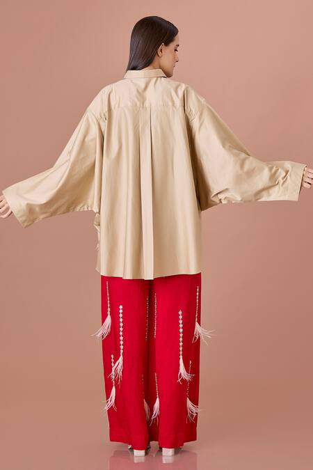 Brown Blended Cotton Embroidery Sequin Collar Oversized Shirt With And Feather