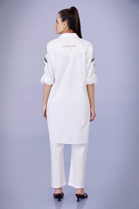 White pathani tunic featuring thread embroidery in a floral pattern. Paired with coordinating trousers and designed with rolled-up sleeves and side pockets.