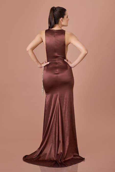 Brown Stretch Satin Embroidery Sequin Plunging V Neck Draped Embellished Gown