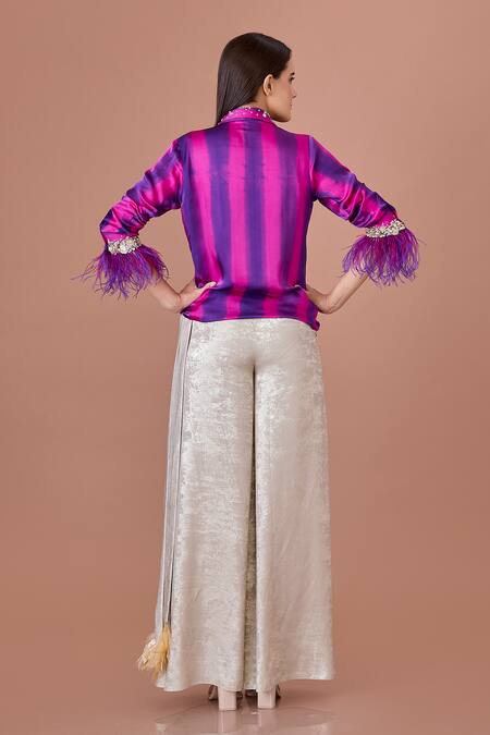 Purple shirt featuring full sleeves with feather embellishments and tie dye stripes