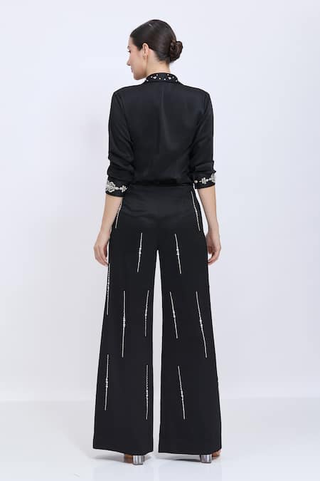 A black satin shirt features hand embroidery on the collar and cuffs, with front button closure. It is paired with a black velvet waistband trouser adorned with hand embroidered motifs and a center back closure.