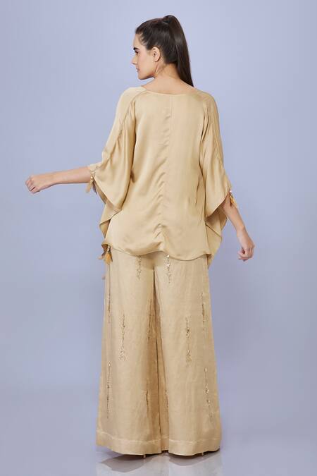 Gold asymmetric short kaftan featuring a V-neckline and cape sleeves with a draped-knotted front silhouette