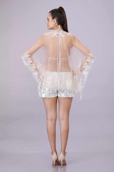 Floral lace embroidery along the edges, Sheer sleeves enhancing the design, V neck neckline for a stylish look