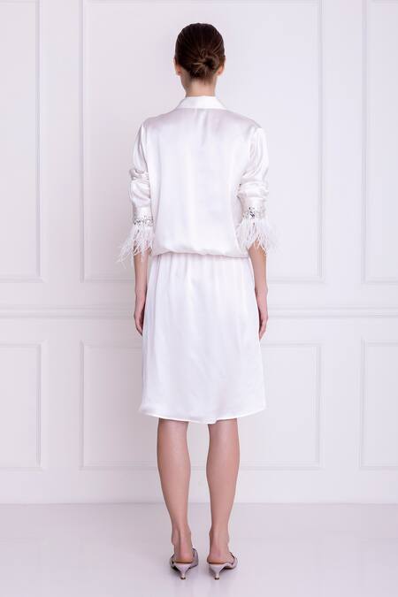Ivory shirt dress in satin base with embellished cuff detail & front twisted knot.