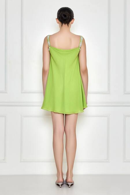 Citrus green flared camisole dress featuring sequin and glass bead embroidery on the straps
