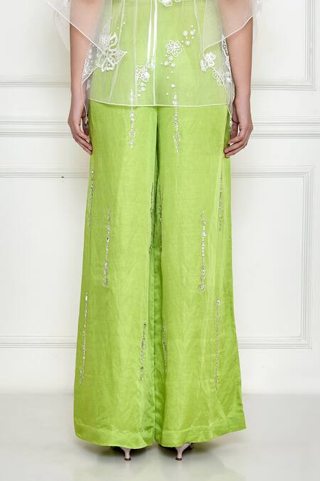 Green Satin Linen Embellished Jewel Mirrorwork Snowflake Pant