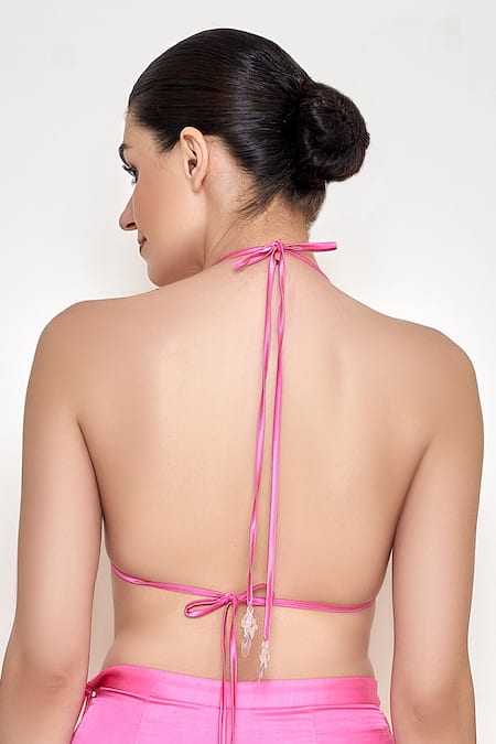 Dopamine pink bikini featuring halter neck design with sequin, stone, and bead embroidery in stripe pattern