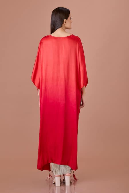 Orange and red ombre kaftan featuring a plunge V-neck, batwing sleeves, and feather and pearls embroidered yoke