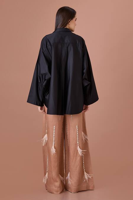 Black shirt featuring peach organza thread embroidery and batwing sleeves