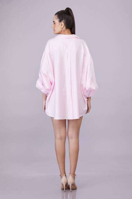 Pink Blended Cotton Embroidery Snow Flake Collared Pearl Shirt