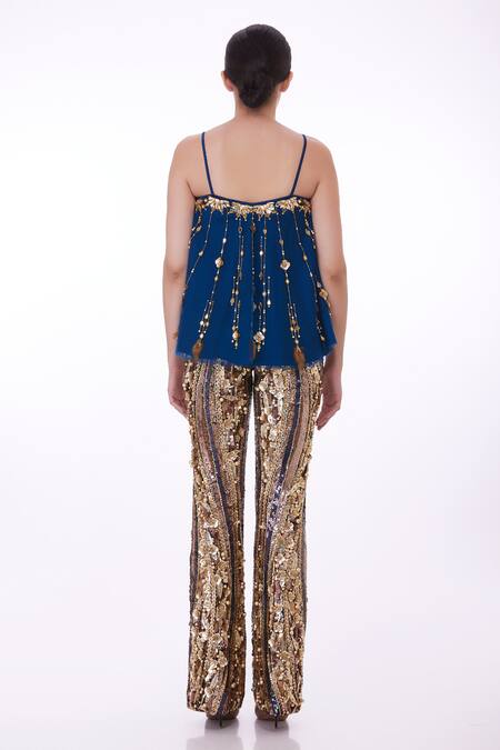 Sapphire blue trouser featuring hand embroidered floral applique with crystal, pearl, stone, and sequin work