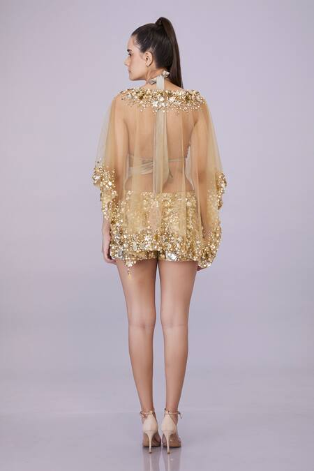 Gold shorts featuring all over tonal sequins, pearls, and stone embellishments