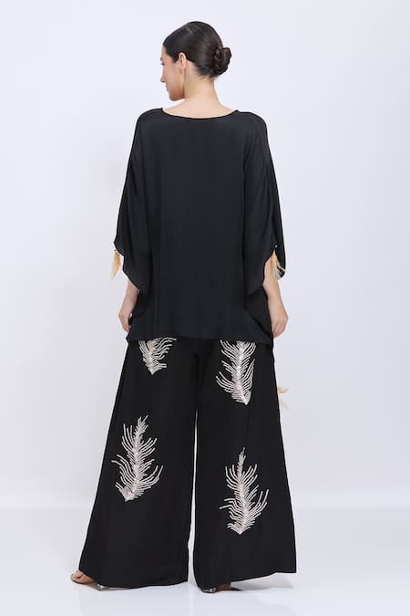 Black palazzo crafted from blended linen, featuring copper sequin fern hand embroidery.