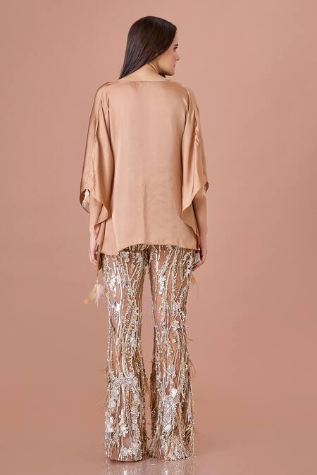 Brown Net Mirrors, Pearls, Sequins, Feathers, Wave Embellished Flared Trouser