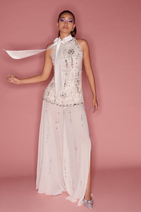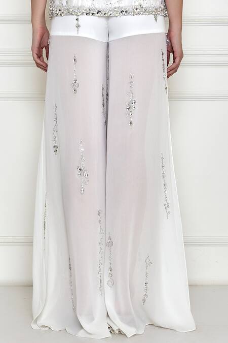 Ivory sharara featuring side slits with all over stone work embellished floral patterns on a sheer base