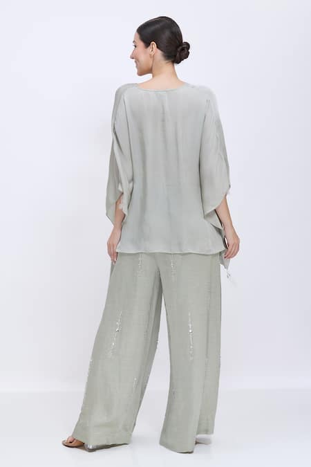 Ash grey palazzo crafted from blended linen fabric, featuring silver snowflake hand embroidery.