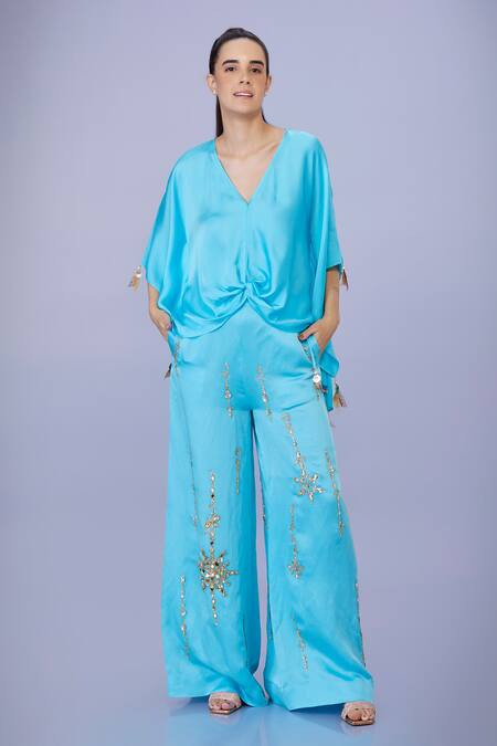 Blue trouser featuring gold sequin, thread, and bead embroidery in a stripe pattern