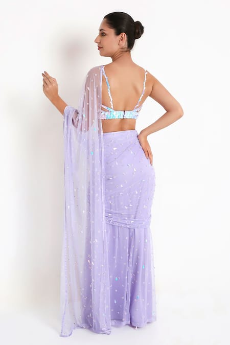 Purple net pre-draped saree featuring intricate bead embroidery. Paired with a sequined spaghetti strap padded blouse.