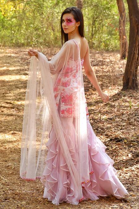 Pink raw silk kurta featuring butterfly print and beaded embroidery. Paired with an organza ruffled gharara and a mirror work net dupatta.