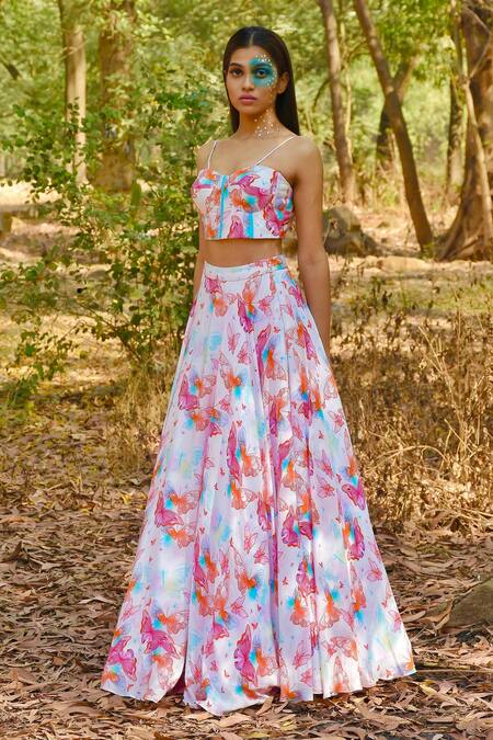 Multi color lehenga featuring butterfly prints and an attached cancan. Paired with a padded corset and an organza ruffled bolero jacket.