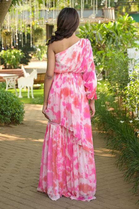 Pink georgette draped one-shoulder padded kurta featuring a tie-dye pattern and tasseled flared sleeves. Paired with a gharara that has gota hand embroidered lines and an elasticated waistline.