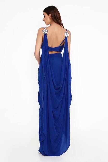 Blue saree gown featuring a floral cutwork embroidered bodice and attached drape at the back