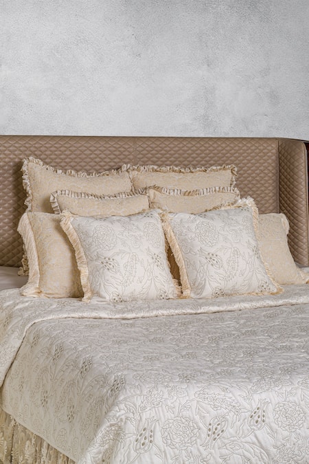 Cream quilted bedding set with thread embroidery in floral pattern including, 1 king size bedcover & 2 cushion cover.