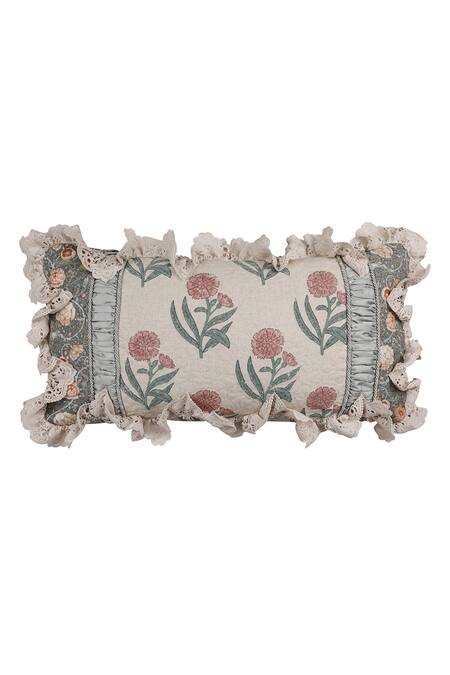 White Cotton Linen Floral, Thread Eve Embroidered Bed Runner And Cushion Set