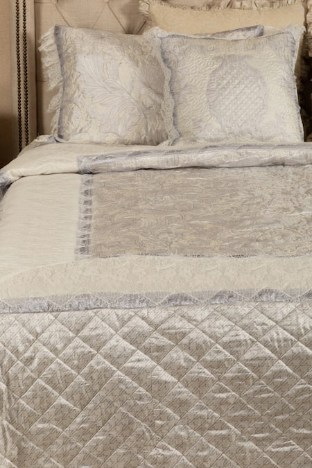 Buy_Diva Riche_Cream Washable Silk Floral, Geometric Print Quilted Pattern Bedding Set_at_Aza_Fashions