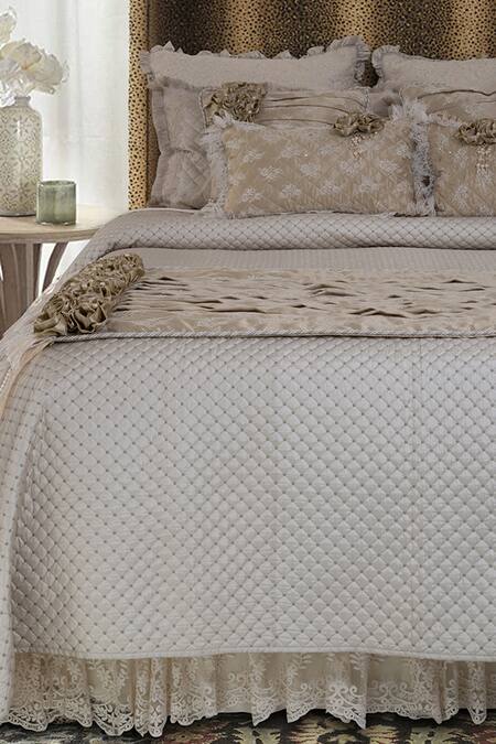 Gold washable silk quilted bedding set with stitchline thread and floral applique embroidery. The set includes a king size bedcover, four cushion covers and a runner.