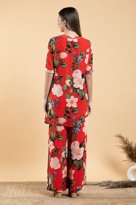 Red flared kurta featuring wild rose florals and green leaves print with short sleeves and V-neckline. Paired with coordinating printed palazzo with attached lining.