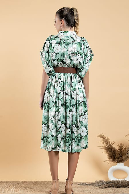 Green kimono dress featuring wild apple floral and green leaves prints