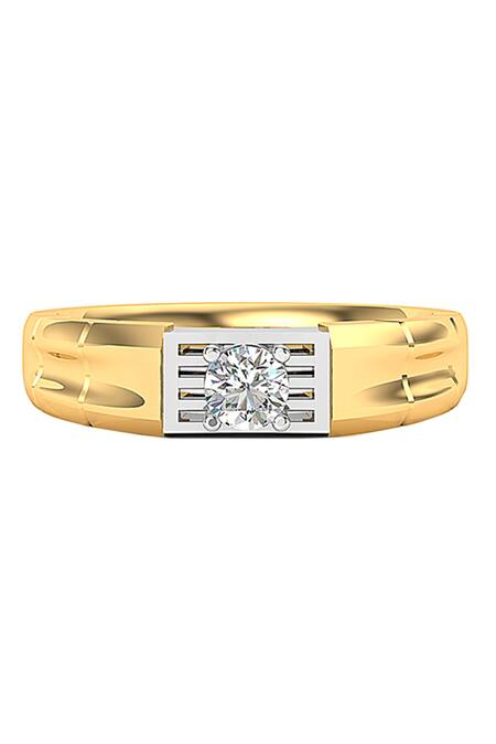 18kt yellow and white gold geometric carved ring featuring a round-cut solitaire diamond
