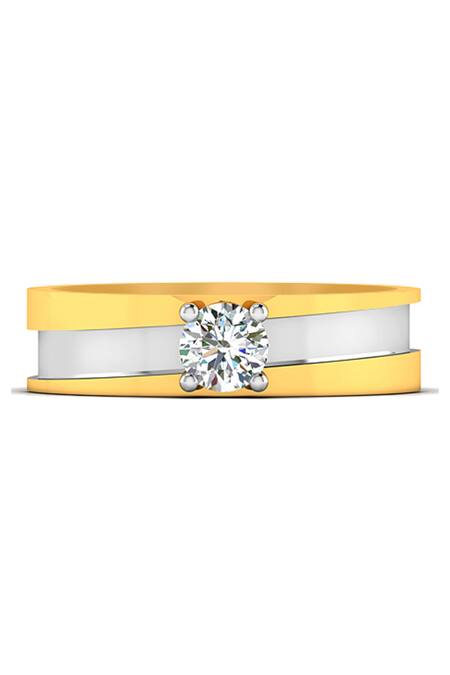 Gold ring featuring a single round diamond solitaire with a two-tone band. Crafted in 18kt gold, it showcases a unique design with yellow and white gold accents.