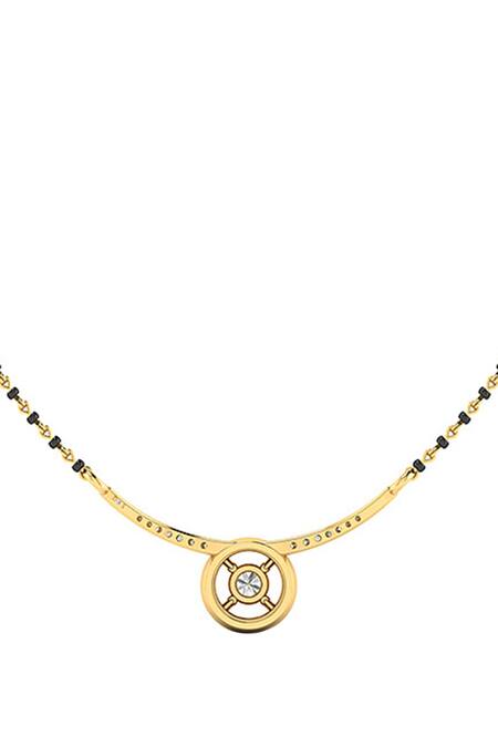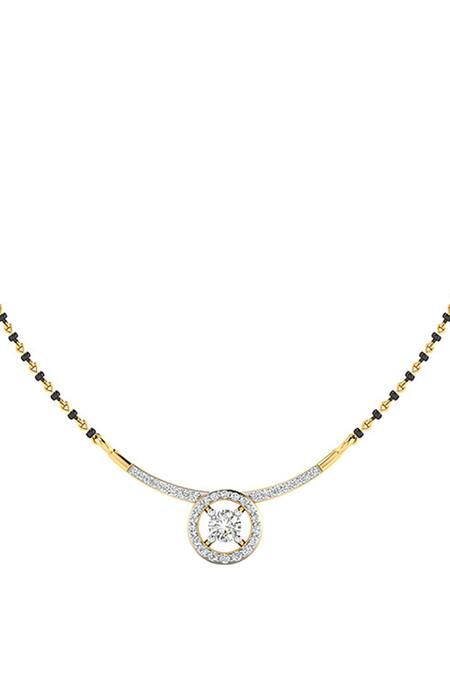 18kt gold mangalsutra featuring round-cut diamond embellishments. Adorned with a central diamond and additional side diamonds for a sparkling effect.