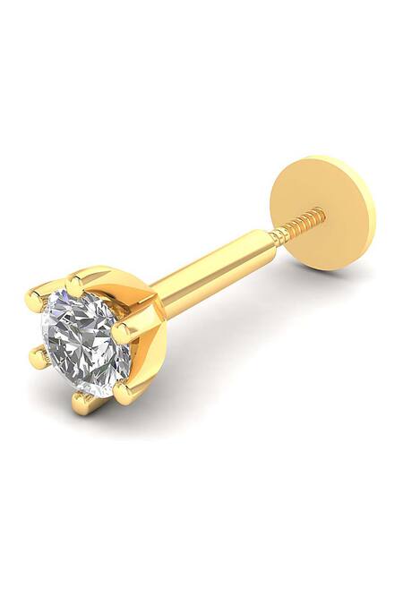 18kt yellow gold nose pin featuring a round cut diamond embellishment. The diamond has a total carat weight of 0.23 and is set in a contemporary design.