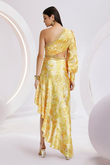 Yellow satin one-shoulder dress featuring abstract print with hand embroidery of beads and stones