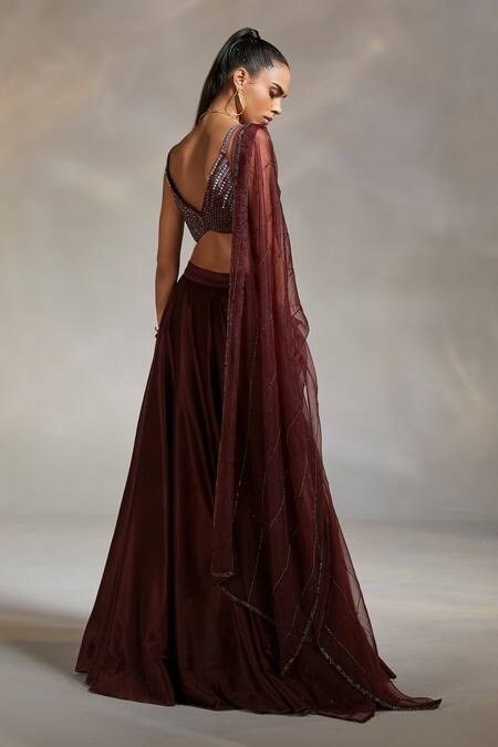 Wine heavy satin lehenga with attached cancan & flared silhouette. Paired with embellished padded blouse & dupatta.