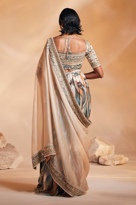 Multi color organza and chiffon pre-draped saree with abstract print details. Paired with an embroidered padded blouse.