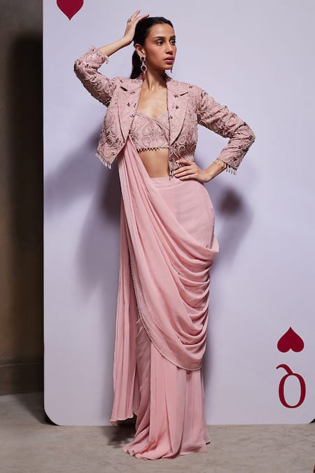 Blush pre-draped saree featuring linear pearl stripes and a swirl pattern embellished blouse. Includes a side zip closure for the saree skirt and a sleeveless design for the blouse.