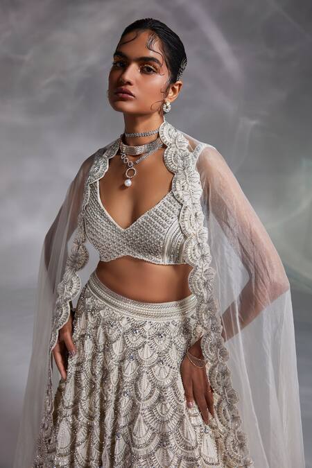 Off-white silk lehenga with attached cancan & pearl, crystal, scallop embellishment. Paired with padded blouse & dupatta.