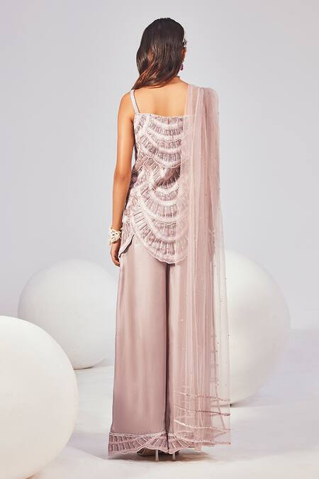Lilac kurta featuring a square neckline with scalloped seashell pattern embellishments of pearls and sequins. Paired with matching palazzo and tulle dupatta.