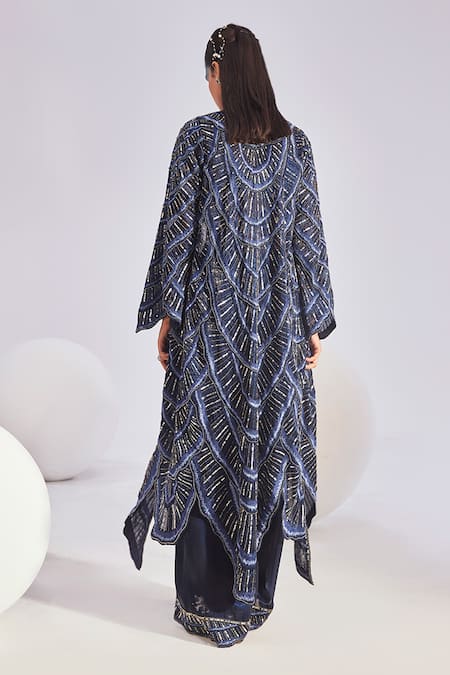 Blue Organza Sequins, Pearls V-neck, Open Embroidered Cutdana Jacket Palazzo Set