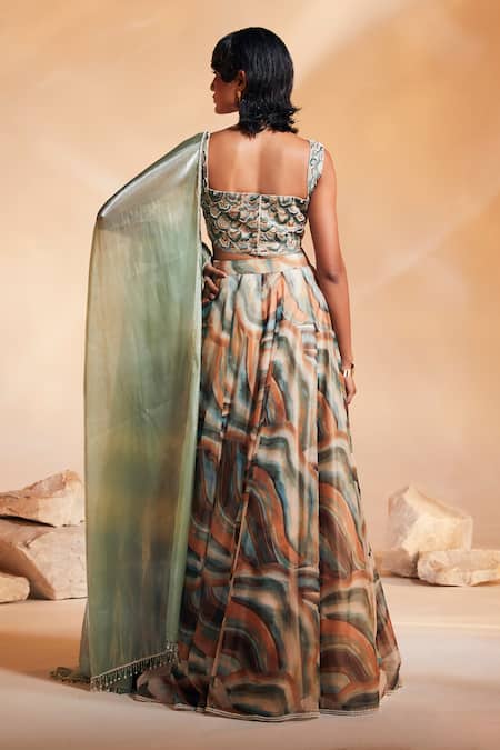 Multi Color Organza Abstract Print, Beads Embroidery Square Emery Lehenga Set