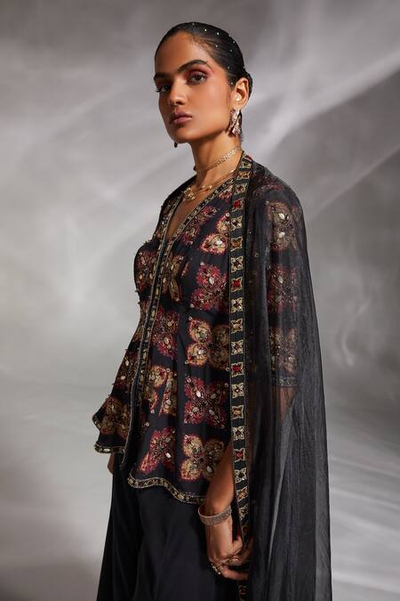 Black georgette kurta with traditional print & bead work embroidery. Comes with sharara & dupatta.