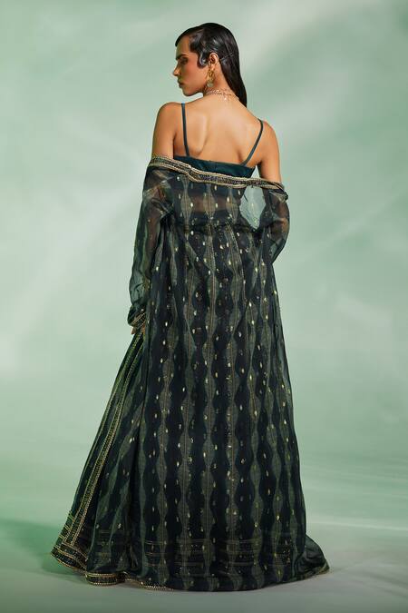 Dark green cape with leaf print & embroidered placket. Paired with padded blouse & lehenga with attached cancan.