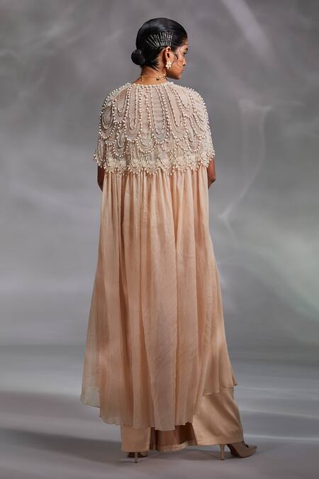 Beige cape with bead, scallop embellishment. Paired with padded corset & draped skirt.