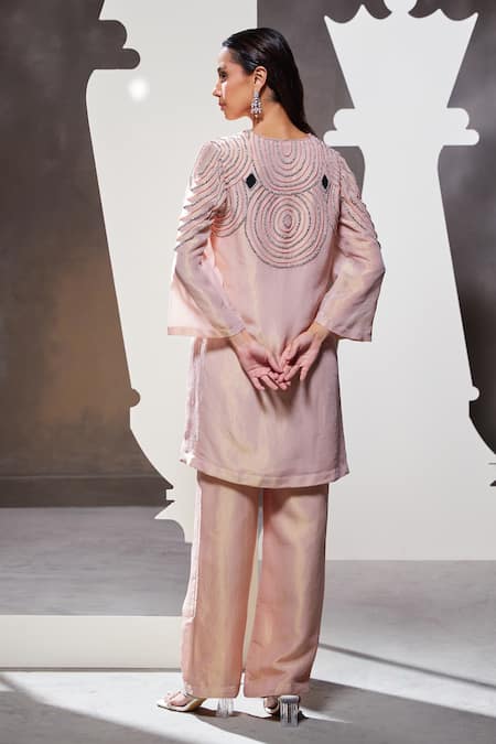 Blush kurta featuring geometric hand embellishments and a V neck. Paired with straight pants for a complete look.