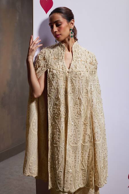 Intricate pearl detailing on the pant, Scalloped hem on the cape, Embellished blouse with sweetheart neckline