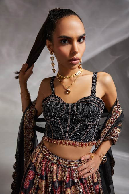 Black silk dupion lehenga with attached cancan, traditional print all over & embroidery details. Comes with padded corset blouse & dupatta.